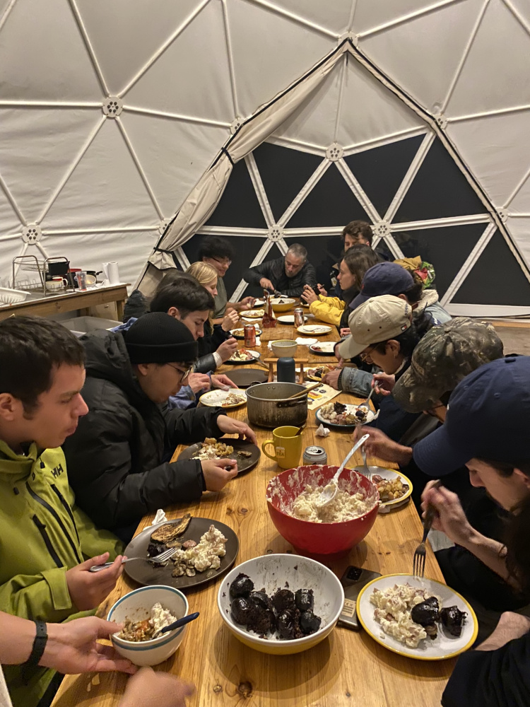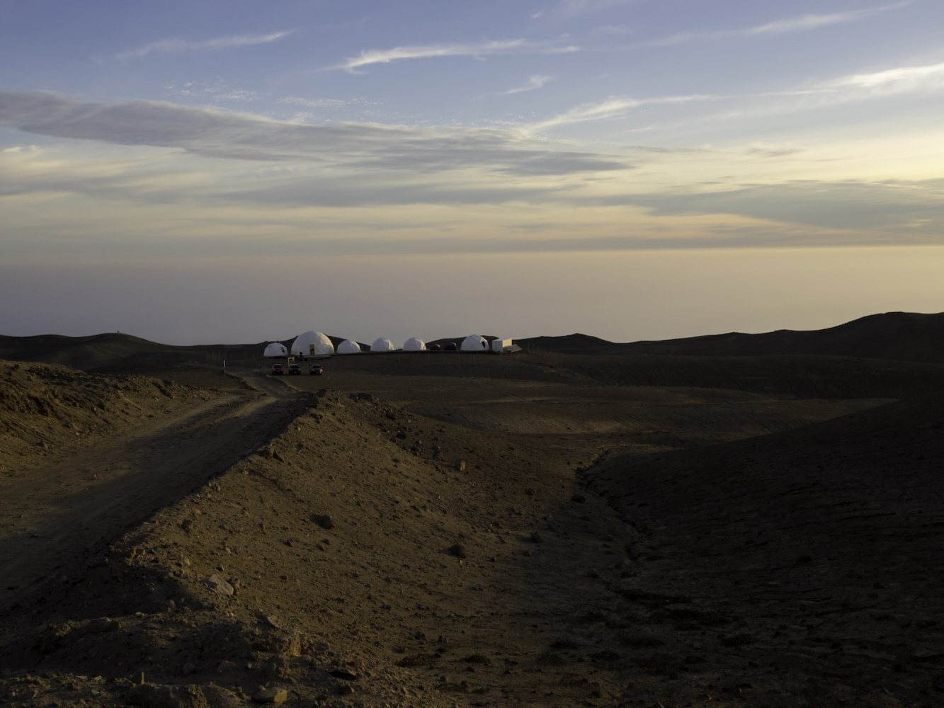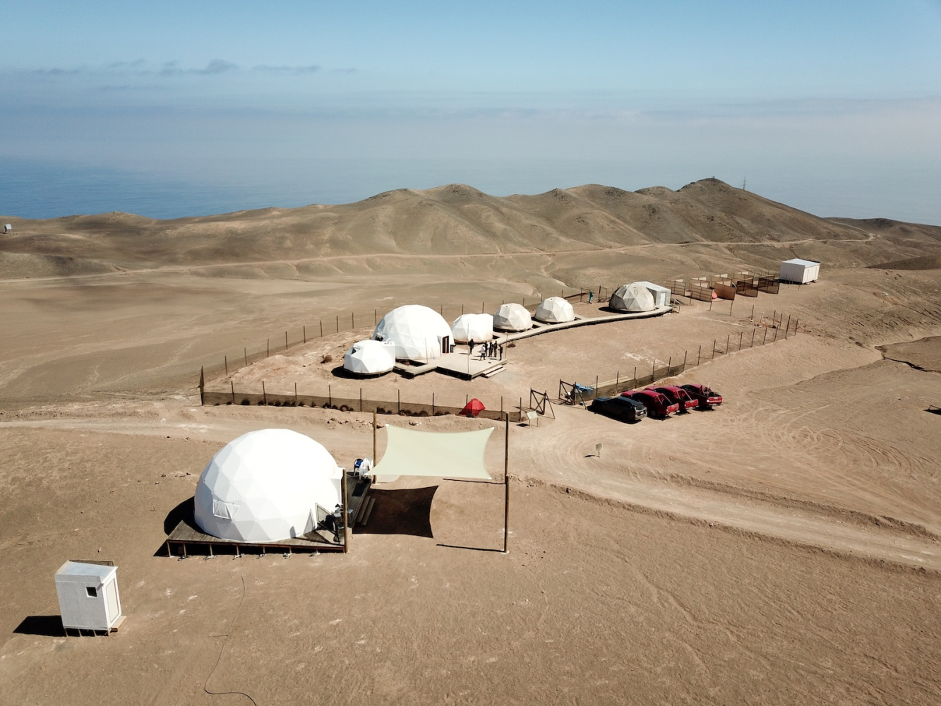 Domo principal con cocina, comedor y refrigerador. 4 domos dormitorios investigación(capacidad 4 personas c/u), 5 domos dormitorio estudiantes (capacidad 5 personas c/u) y baños con ducha fría. Domo Desierto Vivo, invernadero y pañol de herramnientas. Todas las instalaciones energizadas vía sistema solar fotovoltáico y agua de niebla.